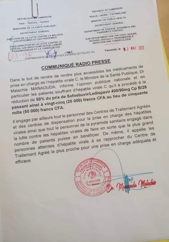 C’est à la faveur d’un communiqué signé le 3 mai 2023 que le Ministre de la santé publique a informé l’opinion publique de la réduction de 50% du prix de ce médicament important dans le traitement de l’hépatite B. Ainsi, au lieu de 50 000 francs,il va désormais coûter 25 000.